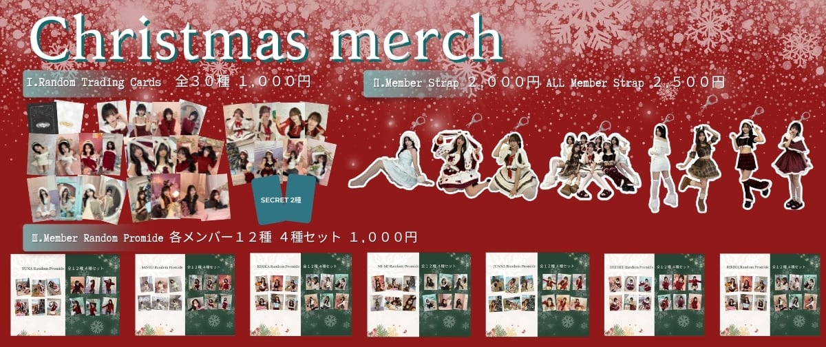 【商品説明】 クリスマスデート服6種&クリスマス衣装6種、全12種の中から ランダムで4枚が入ったスペシャルセット。 季節感たっぷりの多彩なビジュアルがそろっており、 どのカットが届くかは開けてからのお楽しみ! 冬の特別な表情や雰囲気をコレクションできる、ワクワク感満載のアイテムです。 ✨ <特典情報> ✨ 2セットご購入の方には、ALL memberブロマイド(全3種)を1枚プレゼント! ここでしか手に入らない特別ビジュアルをぜひお迎えください。 〈仕様〉 ・プロマイド 全12種(デート服6種/衣装6種) ・ランダム4枚入り ・L判サイズ 〈注意事項〉 ・中身はランダムのため、同じ絵柄が重複する場合があります。 ・実物と色味が異なる場合があります。 ・数量限定につき、なくなり次第終了となります。 ・こちらの商品にはサインは付いておりません。 LIVE会場にてサイン券との併用をおすすめいたします。